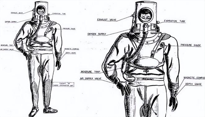 他们穿着一套30多公斤重的潜水服,包括金属头盔、氧气瓶、二氧化碳吸收瓶、配重铅块、饮水和流食。