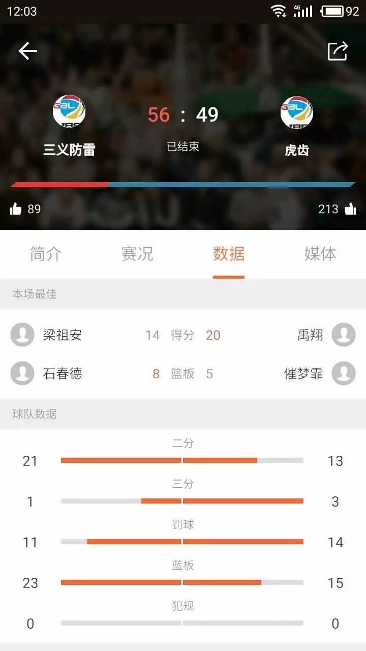 比赛开始后,三义防雷先发制人,小快灵是他们打球的特点。在18号的带领下,三义防雷能突能投能抢,上半场27-19领先虎齿进入下半场。下半场,拥有身高优势的虎齿,始终没能发挥出自己的优势,被三义防雷的进攻节奏打乱了,自己也打得比较着急。反观三义防雷这边,越打越有感觉,充分发挥了小快灵的特点,冲抢也十分积极,多次抢得前场篮板!虎齿这边陷入了各自为战,第三节,被三义防雷打了23-12比分就此拉开。第四节,虎齿似乎有些苏醒,找到了比赛的感觉,在21号的带动下,虎齿开始了反击,本节他们打了三义防雷18-6,可惜前面挖的坑太深,最终,虎齿49-56遗憾落败三义防雷