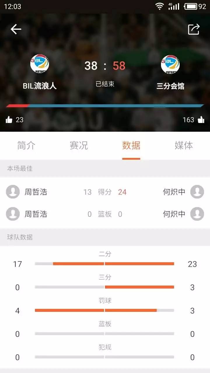 比赛开始后,流浪人率先进入状态。在15号的带动下,流浪人第一节打了三分会馆14-9,是一个不错的开始!第二节,三分会馆30号外线发火,飚中一记三分,带领球队在第二节将比分反超。上半场结束,流浪人25-29暂时落后。下半场,还是三分会馆30号一波连续得分,打乱了流浪人。流浪人这边,进攻受到限制,第三节他们只得了5分,三分会馆趁机扩大领先优势,第三节结束,三分会馆领先流浪人十分之多进入第四节。第四节里,流浪人再无建树,最终,三分会馆58-38大胜流浪人