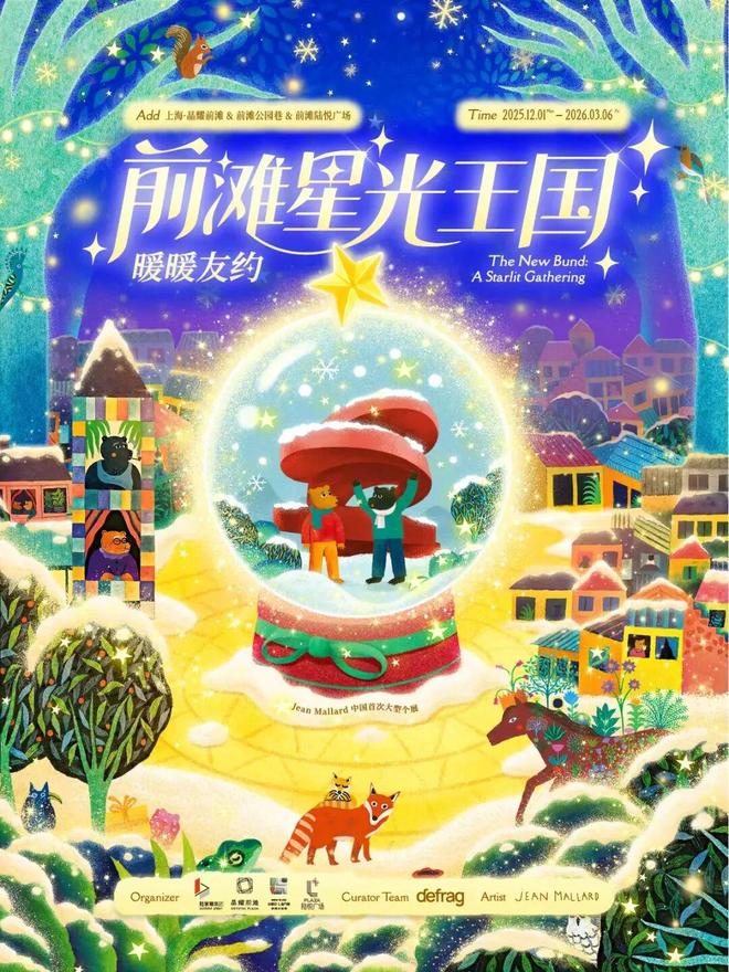 12月6日至2026年3月6日,前滩冬日季「前滩星光王国·暖暖友约」大型公共艺术展温暖启幕。活动以法国艺术家Jean Mallard的绘本创作为灵感,打造26组沉浸式装置艺术,晶耀前滩东区中庭近8米高的熊小宝带你踏上“友情与勇气”冒险之旅。12月6日起,星光“篝火”派对拉开节庆狂欢序幕,音乐舞蹈、马路disco、杂耍巡游等精彩活动轮番上演,奥地利灯光艺术家Georg Öhler打造的奇幻灯光装置也将点亮前滩公园杉果秘境。