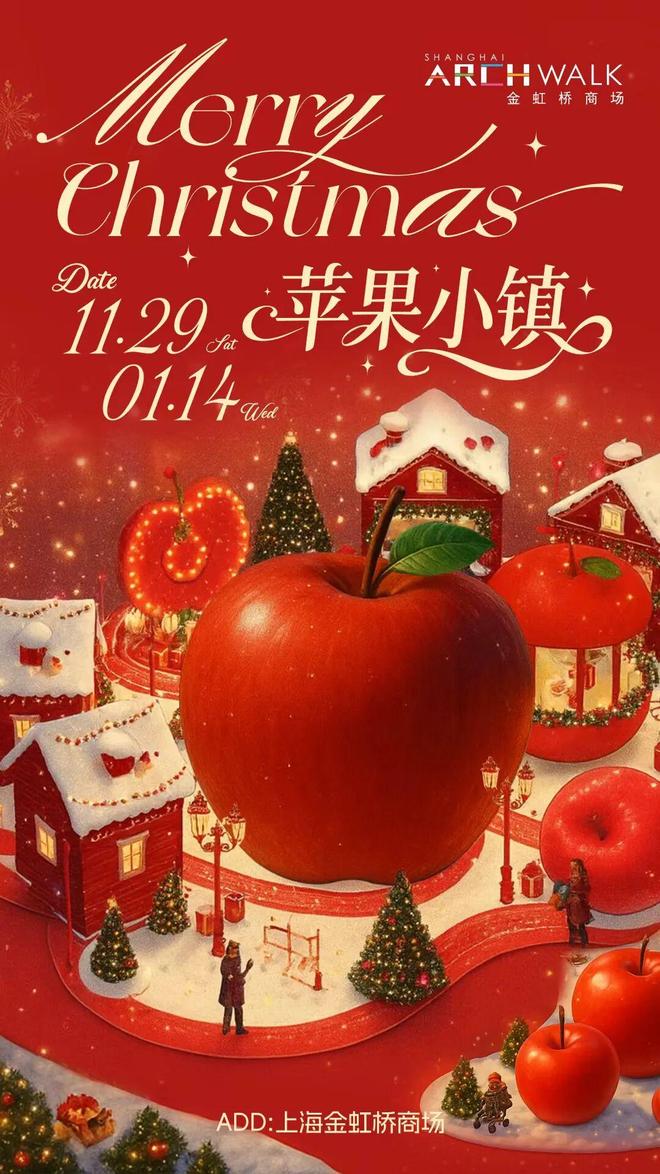 金虹桥商场将整个苹果小镇搬进商场,近10米高的巨型苹果空降,成为魔都新晋打卡顶流。圣诞季,商场还有苹果大派送、梦幻飘雪、苹果主题市集、魔法泡泡秀、圣诞巡游、跨年乐队演奏等丰富活动。活动时间:11月29日 - 1月14日,地点:金虹桥商场。快来打卡,感受圣诞与新年的欢乐氛围!