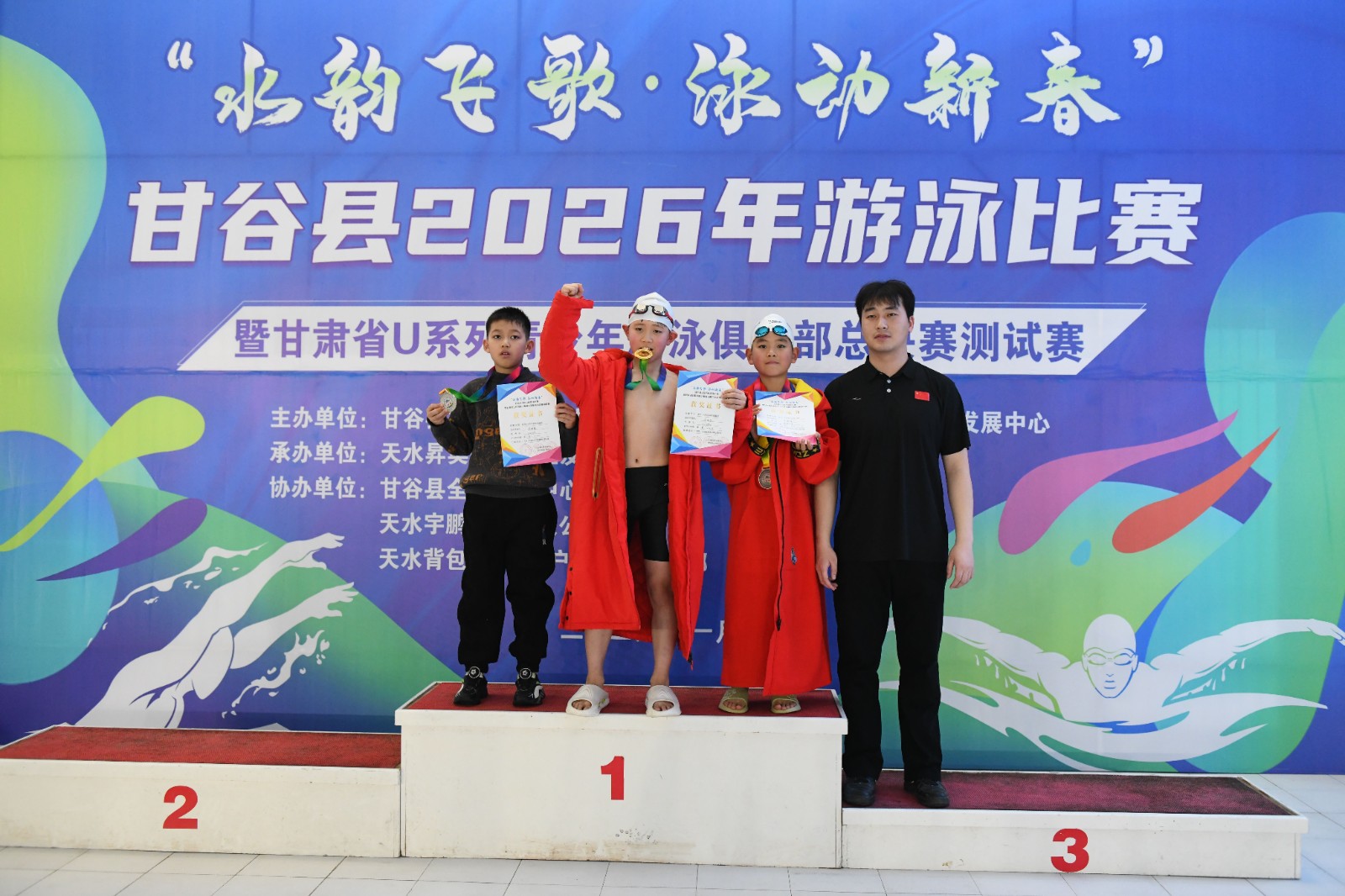 1月1日,2026年甘谷县“水韵飞歌·泳动新春”游泳比赛在甘谷县游泳馆开赛,来自全市的6支代表队,120多名运动员参加。