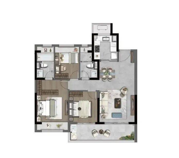 约105㎡三房:三间卧室都朝南,采光非常好。双开间的阳台连接客厅,视野和空间感都更开阔。主卧带独立卫生间和衣帽间,餐客厅和厨房一体设计,家人互动更方便。